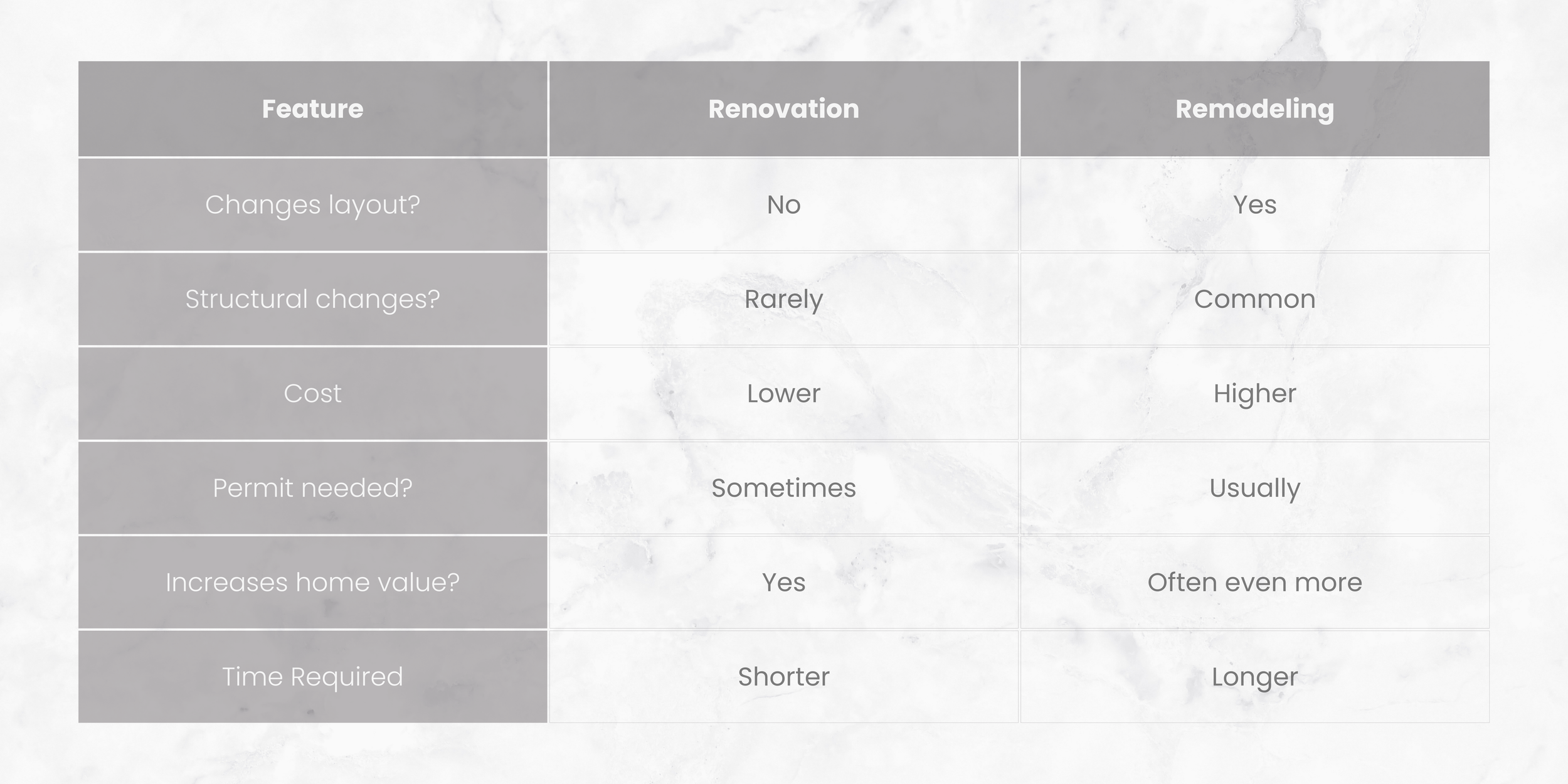 A renovation updates or refreshes a space without changing its structure or layout. You’re improving what already exists.